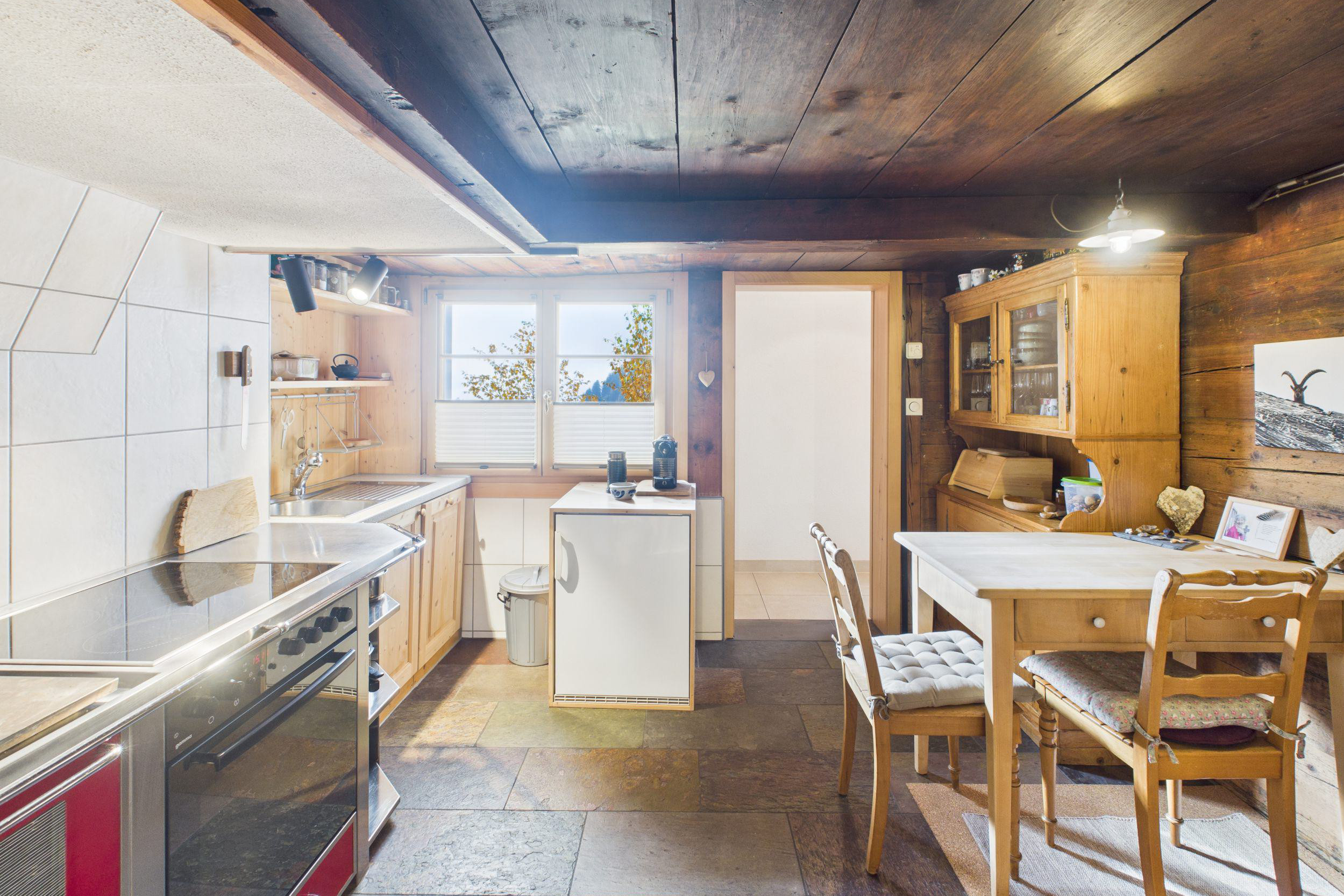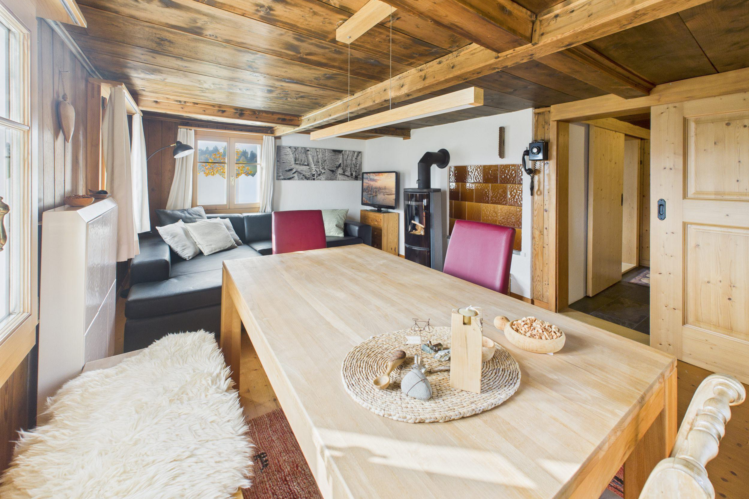 Vom Eingangsbereich gelangt man entweder in das heimelige Wohnzimmer mit Schwedenofen, das zum Verweilen und Wohlfühlen einlädt, oder in die gemütliche Küche, unter anderem ausgestattet mit einem Holzherd, der für eine warme und ursprüngliche Wohnatmosphäre sorgt.