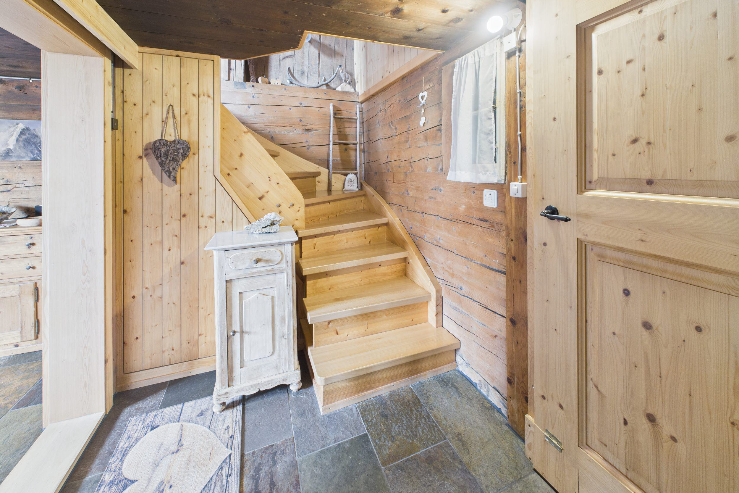 Ein Treppenaufgang mit Podest führt ins Obergeschoss, indem sich ein durchgehend mit sichtbarem Täfer ausgestatteter Bereich eröffnet. Die Holzverkleidung verleiht dem gesamten Stockwerk eine besonders warme und gemütliche Atmosphäre.