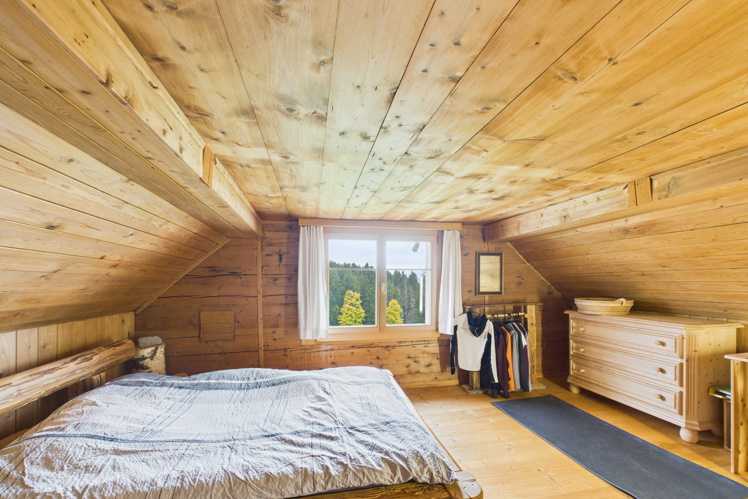 Von da aus gelangt man direkt ins Schlafzimmer mit Dachschräge, welches durch seine charmante Gestaltung und den Ausblick ins Grüne und die Berge zum Rückzugsort wird.