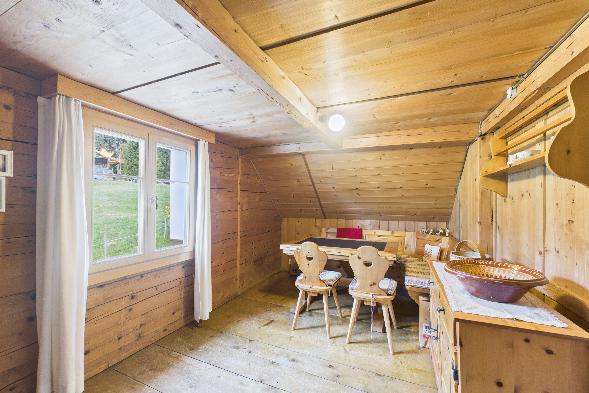 Über ein Durchgangszimmer, das zugleich Zugang zum Dachstock bietet und auch gut als Büro genutzt werden könnte, erreicht man ein weiteres Zimmer. Dieses kann flexibel als zusätzliches Schlafzimmer, Büro oder Atelier genutzt werden – ganz nach den individuellen Bedürfnissen.