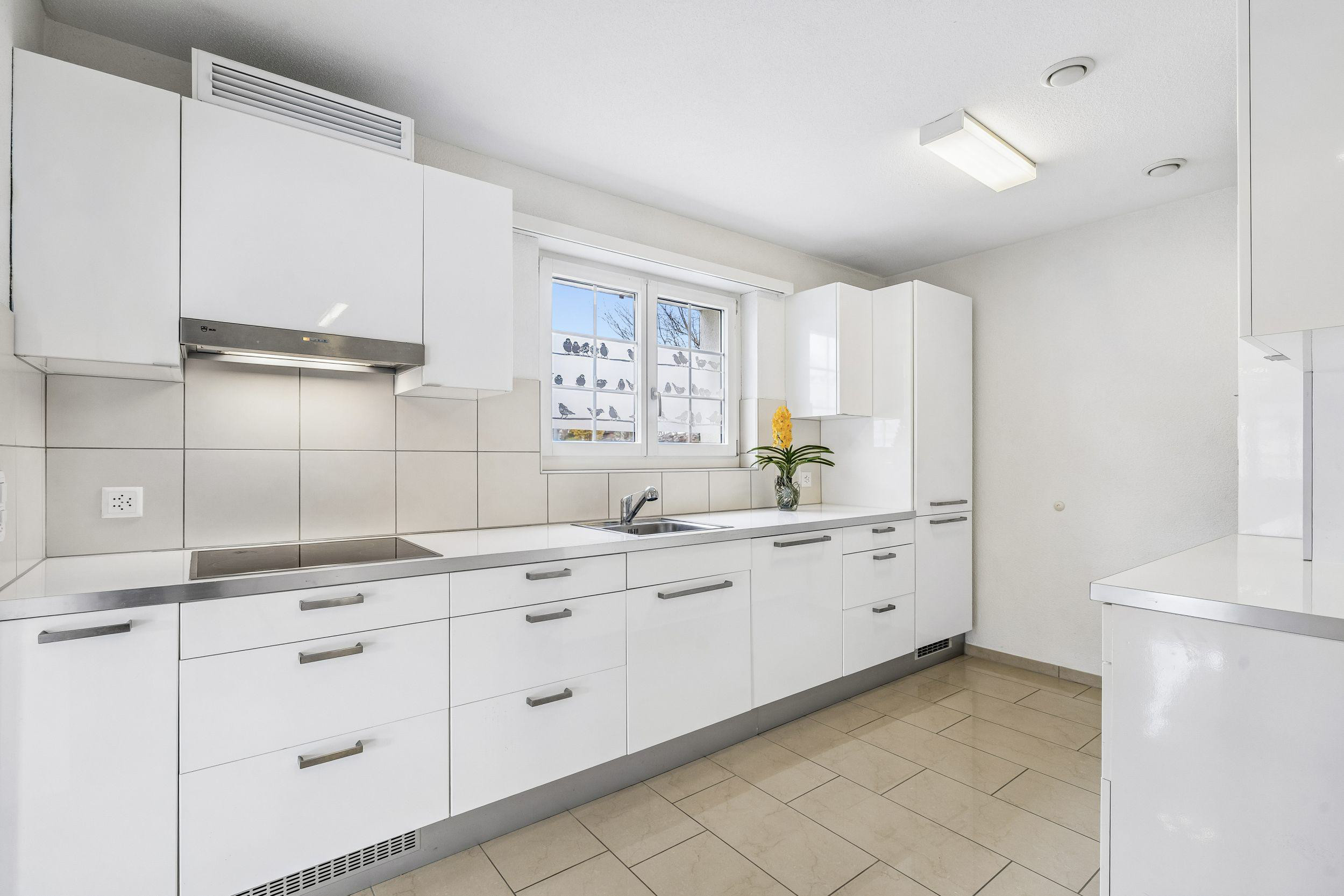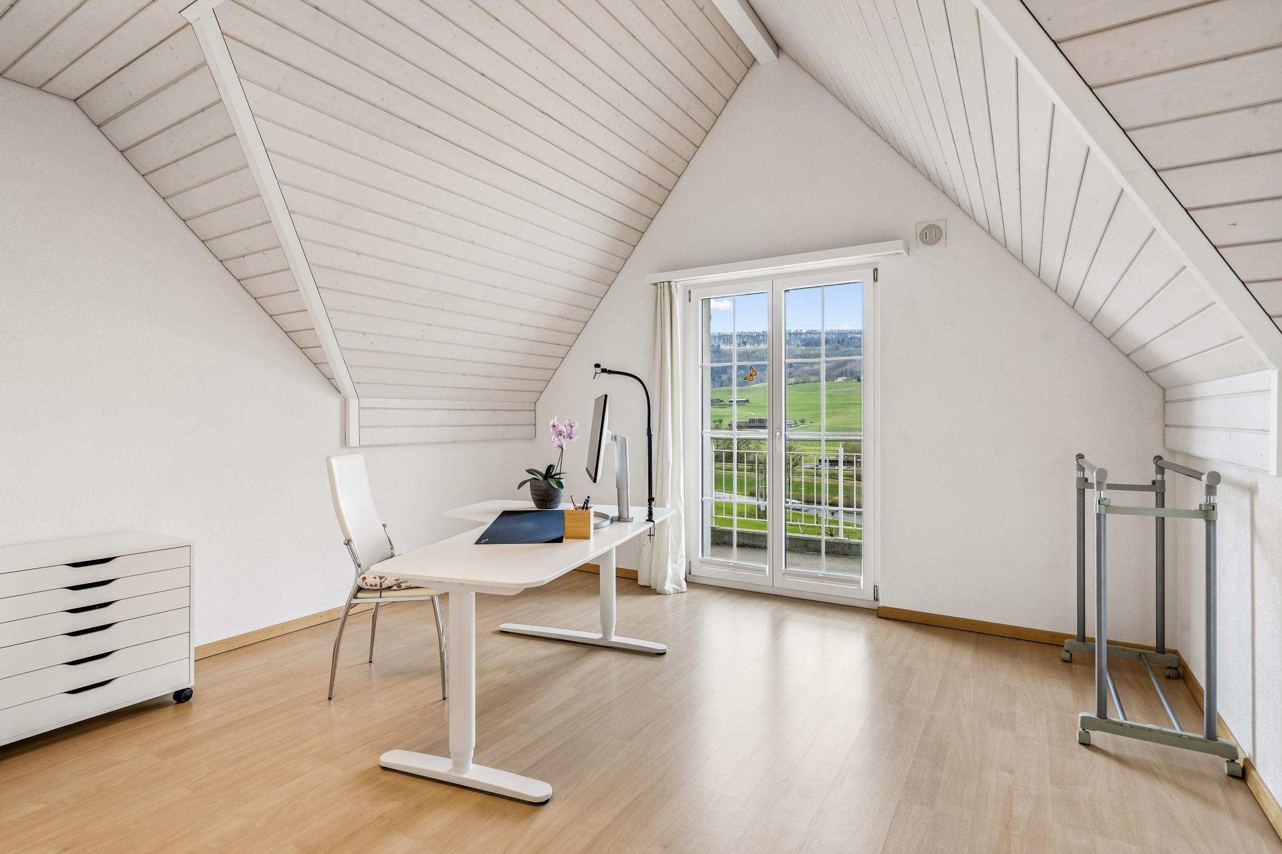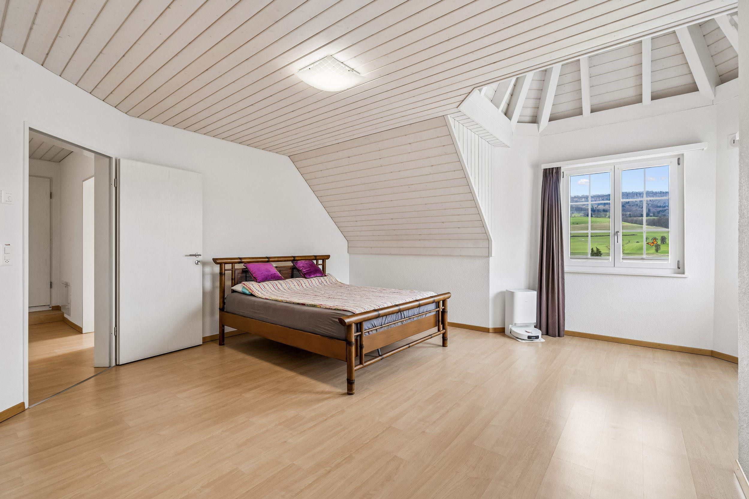 Die moderne Küche ist mit hochwertigen Geräten ausgestattet und bietet viel Ablagefläche und Stauraum. Ebenfalls im Erdgeschoss befindet sich ein ca. 35 m² grosser Raum mit separatem Eingang, welcher beispielsweise als Fitnessraum, Atelier oder Praxis genutzt werden kann. Im Dachgeschoss befinden sich drei helle Schlafzimmer mit charmanten Dachschrägen. Das Südzimmer verfügt über Zugang zum Balkon.