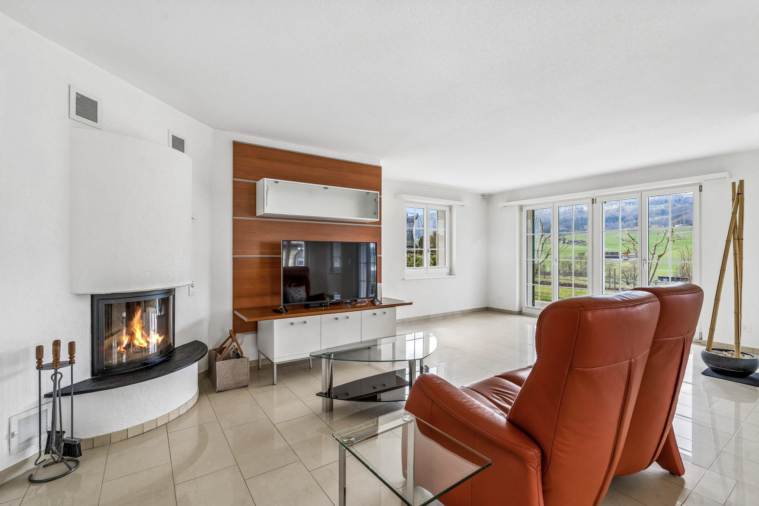 Ein Warmluftcheminée sorgt an kühleren Tagen für behagliche Wärme und Gemütlichkeit.