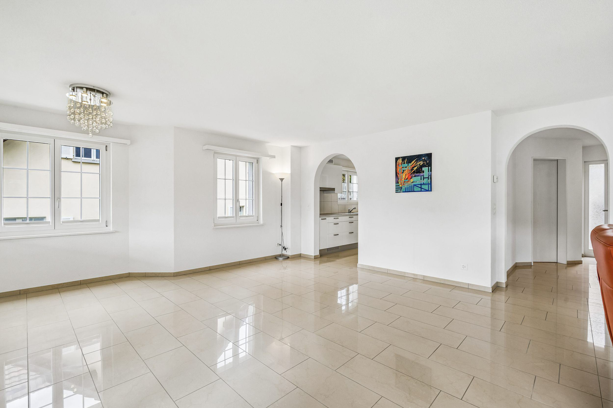 Das einladende Entrée führt in den lichtdurchfluteten Wohn- und Essbereich, welcher nahtlos in den Garten übergeht – ein idealer Ort, um sonnige Tage draussen zu geniessen oder Gäste zu empfangen.